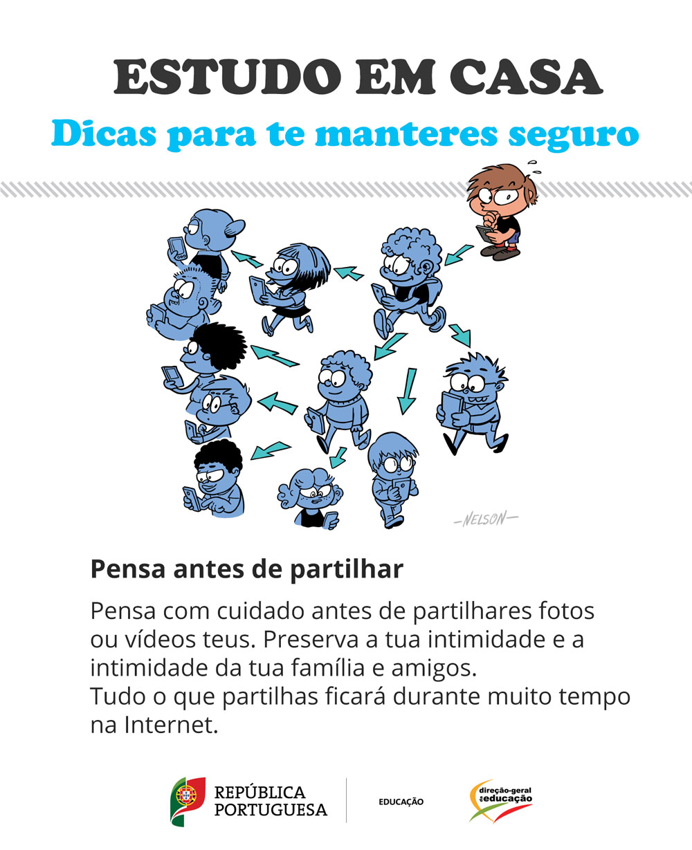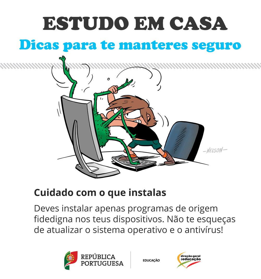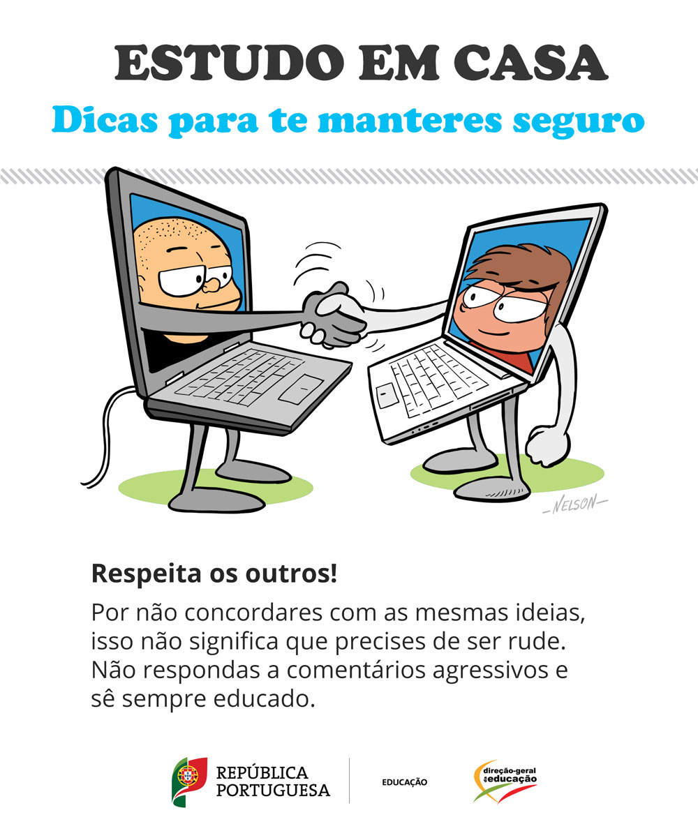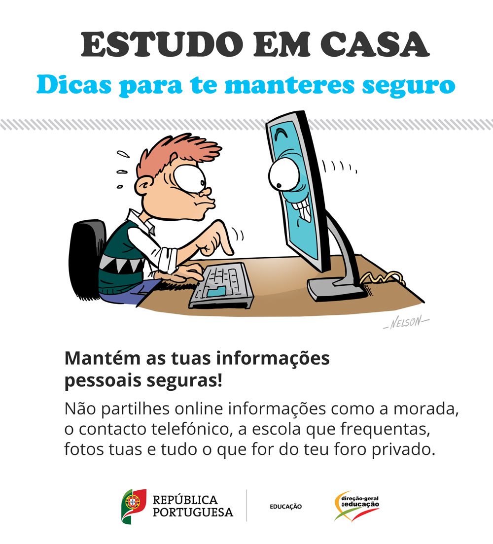 Consulte o folheto de sensibilização “Estudo em Casa: Dicas para te manteres seguro” que contém um conjunto de dicas para que os alunos se mantenham seguros no Estudo em Casa.