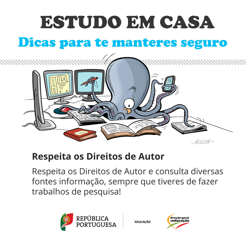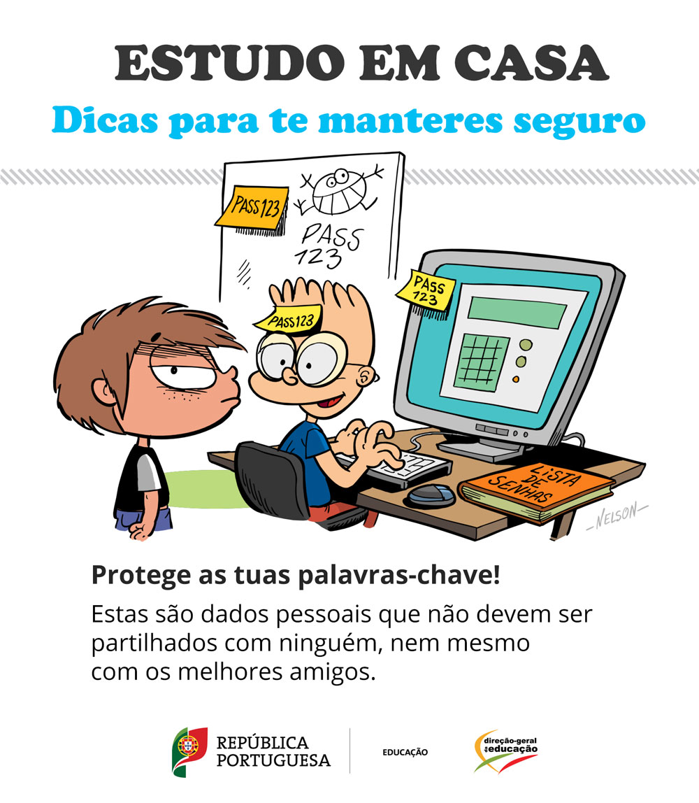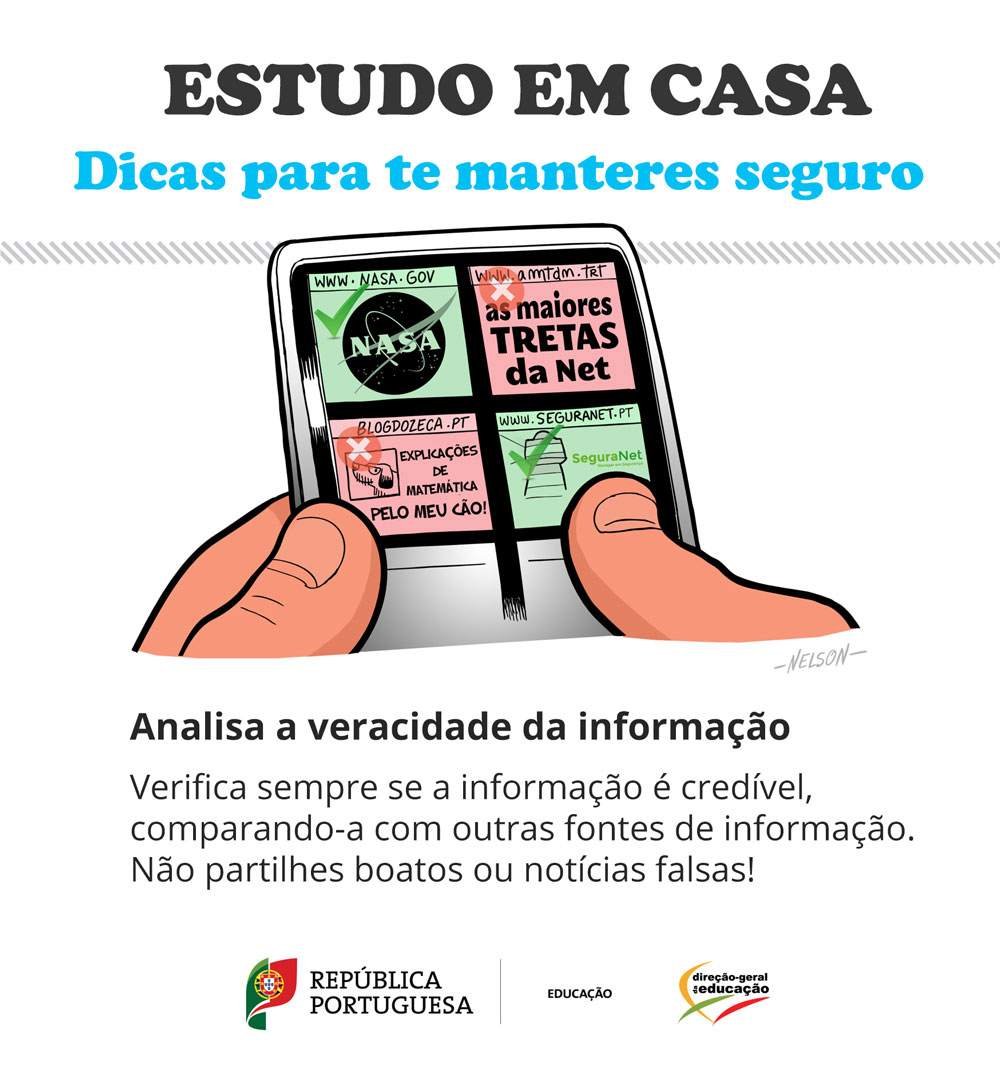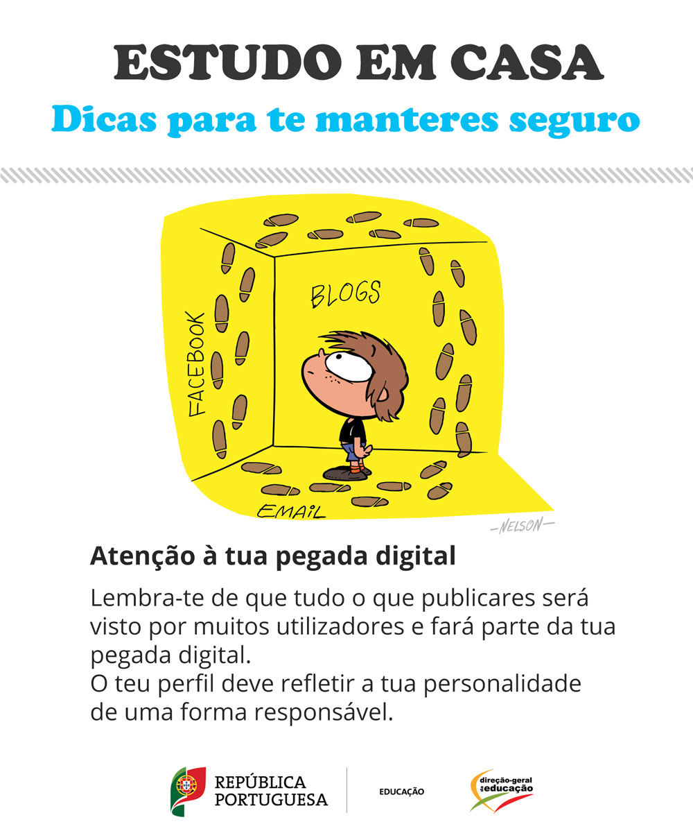 Consulte o folheto de sensibilização “Estudo em Casa: Dicas para te manteres seguro” que contém um conjunto de dicas para que os alunos se mantenham seguros no Estudo em Casa.
