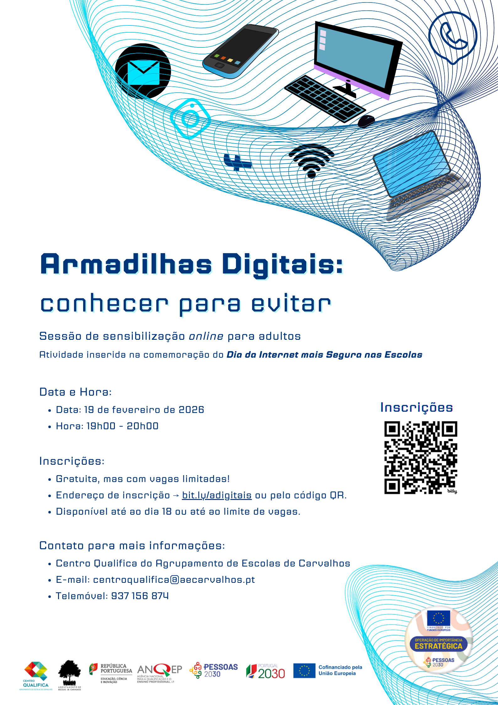 - Para o público adulto (adultos do Centro Qualifica, encarregados de educação e profissionais do Agrupamento), será realizada a sessão online "Armadilhas Digitais: conhecer para evitar", dedicada aos riscos online e às estratégias de prevenção.