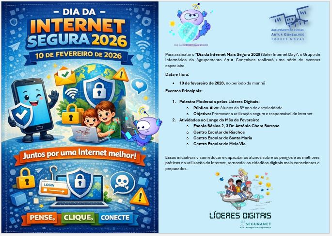 Para assinalar “O Dia da Internet mais Segura 2026 (Safer Internet Day)”, o grupo de Informática do Agrupamento Artur Gonçalves, no dia 10 de fevereiro de 2026, no período de manhã, e no período da tarde, vai realizar uma sessão de sensibilização para os alunos do 5º ano de escolaridade. Sessão essa realizada pelos Líderes Digitais. Os mesmos Líderes também se vão deslocar ao Centro Escolar de Santa Maria, Riachos e Meia-Via, durante o mês de fevereiro, para dar uma Palestra aos alunos do 1ºciclo dessas escolas. Realização de “Brainstorming” em sala de aula com os alunos, analisando as Tiras da SeguraNet e visualizando as animações SeguraNet. A associação de Estudantes, durante a semana vai passar na rádio escola um spot de publicidade da “Segurança na Internet”.