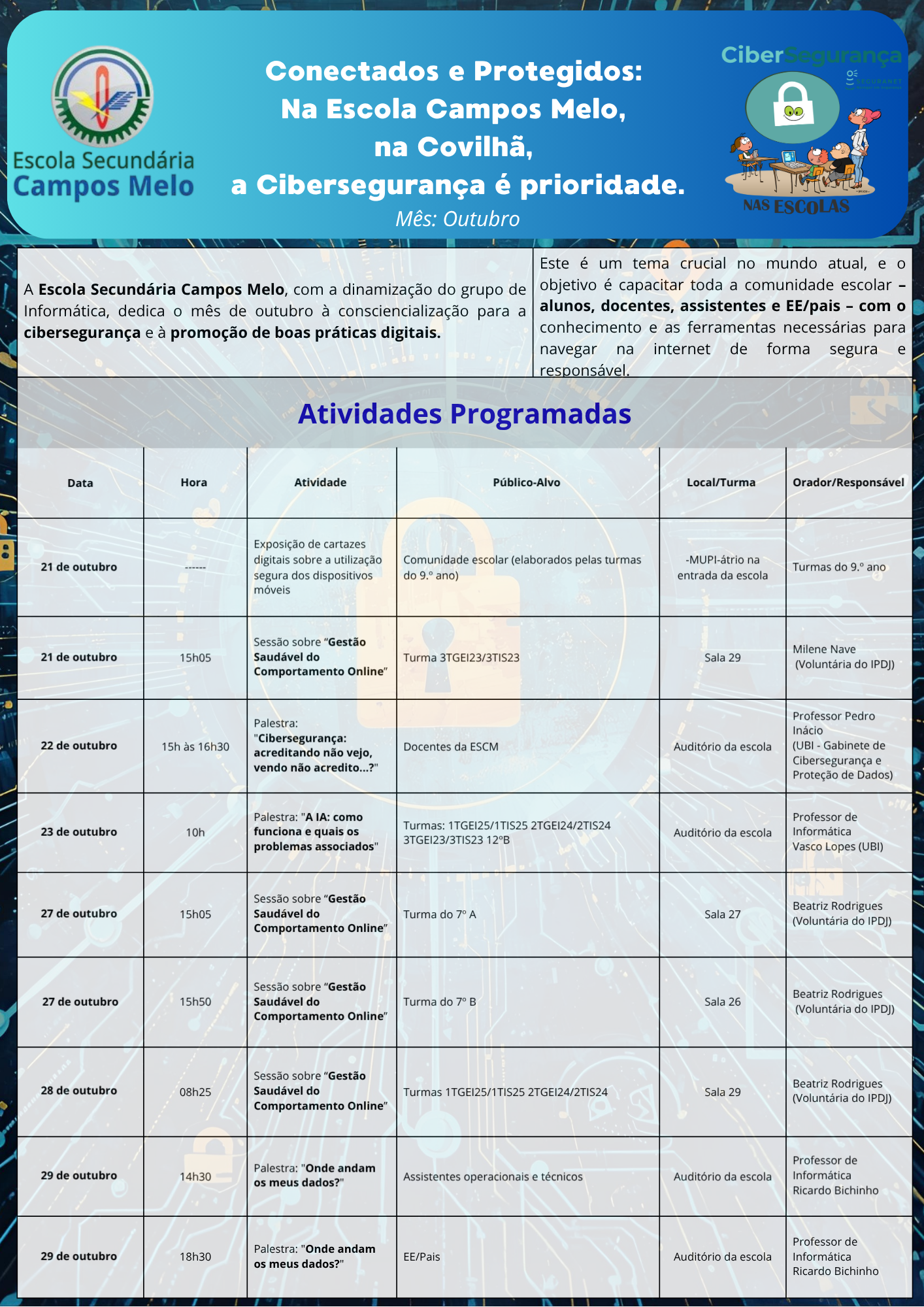 Na Escola Secundária Campos Melo, na Covilhã, o mês de outubro é dedicado à sensibilização para a importância da cibersegurança e à promoção de boas práticas para proteger as nossas redes, dados e informação digital.
