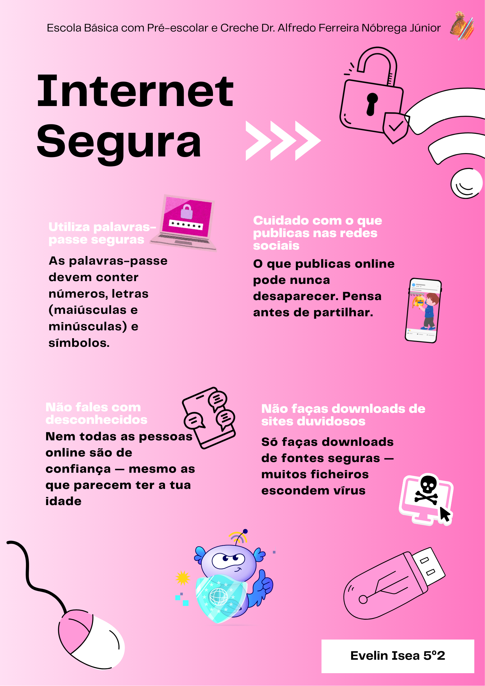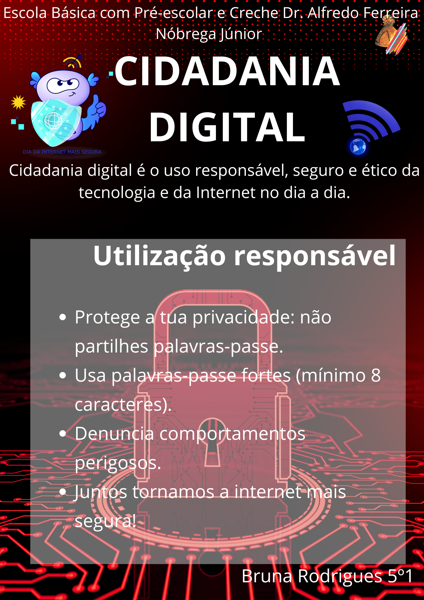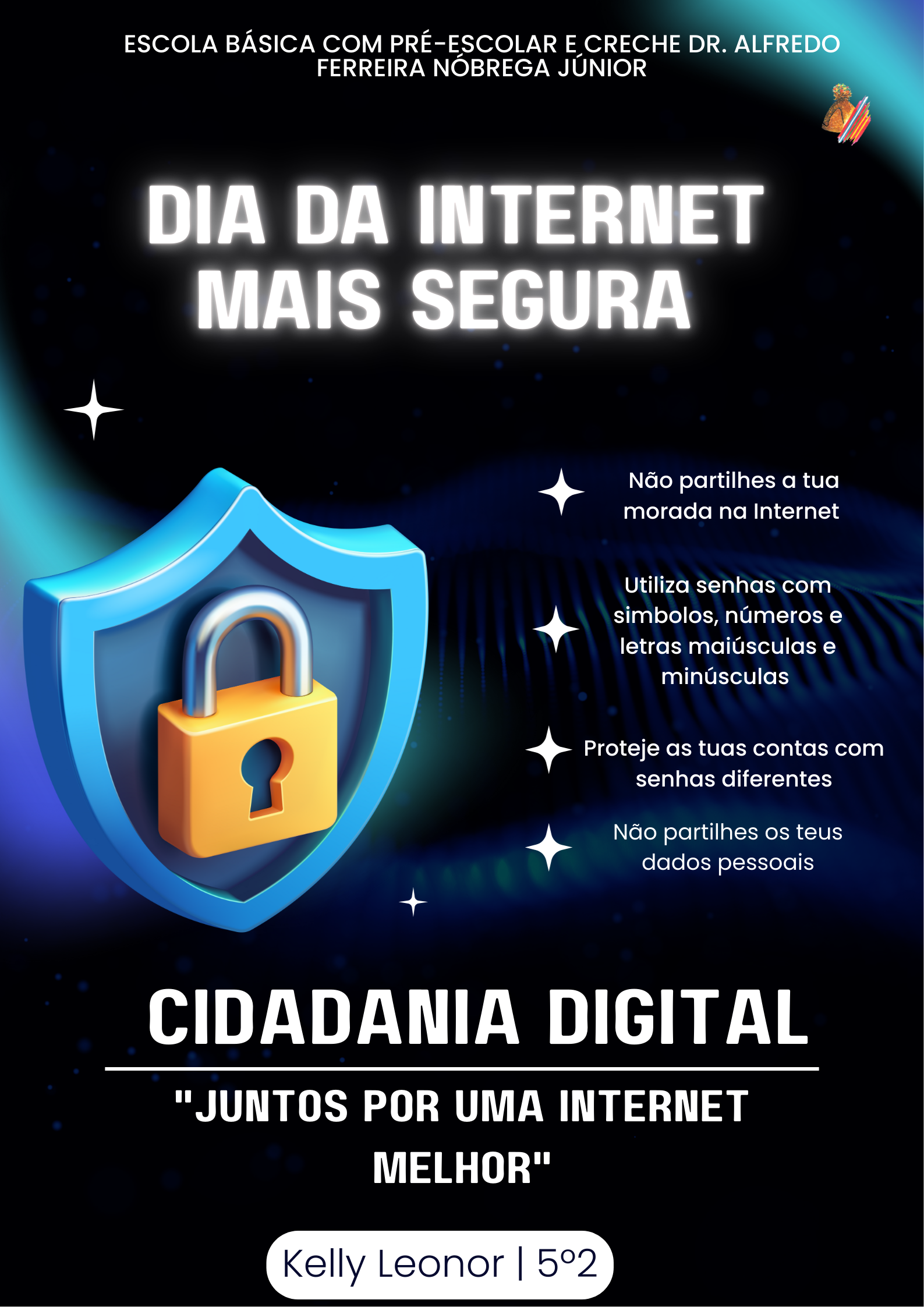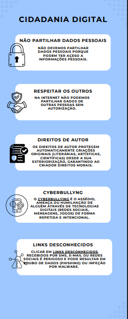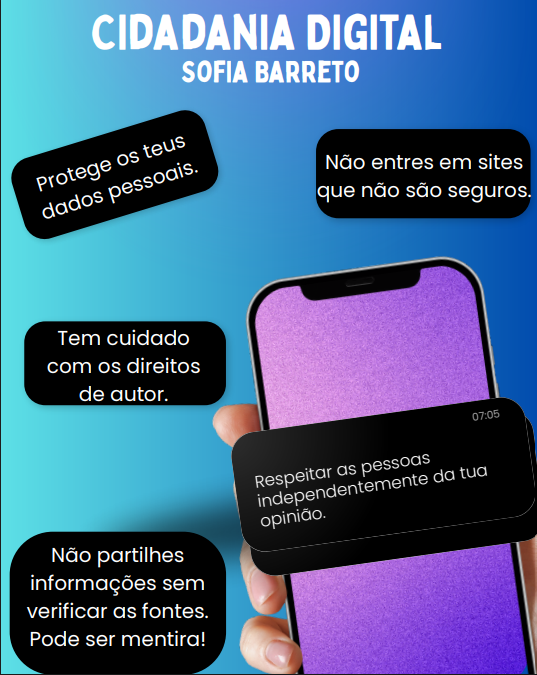 A atividade foi desenvolvida em sala de aula para assinalar o Dia da Internet Mais Segura, durante a qual os alunos exploraram princípios de cidadania digital e criaram cartazes e recursos digitais dedicados à promoção de comportamentos responsáveis online; todo o trabalho foi realizado em contexto de aula e os recursos digitais produzidos serão posteriormente publicados nas redes sociais da escola, contribuindo para sensibilizar toda a comunidade educativa.